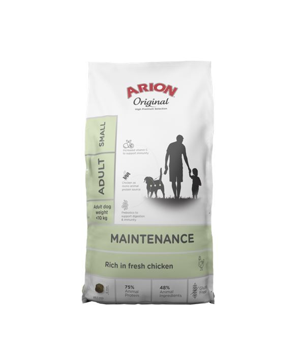 Az Arion Original Maintenance Adult Small egy teljes értékű eledel felnőtt, kistestű kutyák számára, friss csirkehússal. Gluténmentes, csirke alapú monoprotein receptúrája prebiotikumokat, antioxidánsokat és fokozott C-vitamint tartalmaz, hogy támogassa kutyája immunrendszerét.