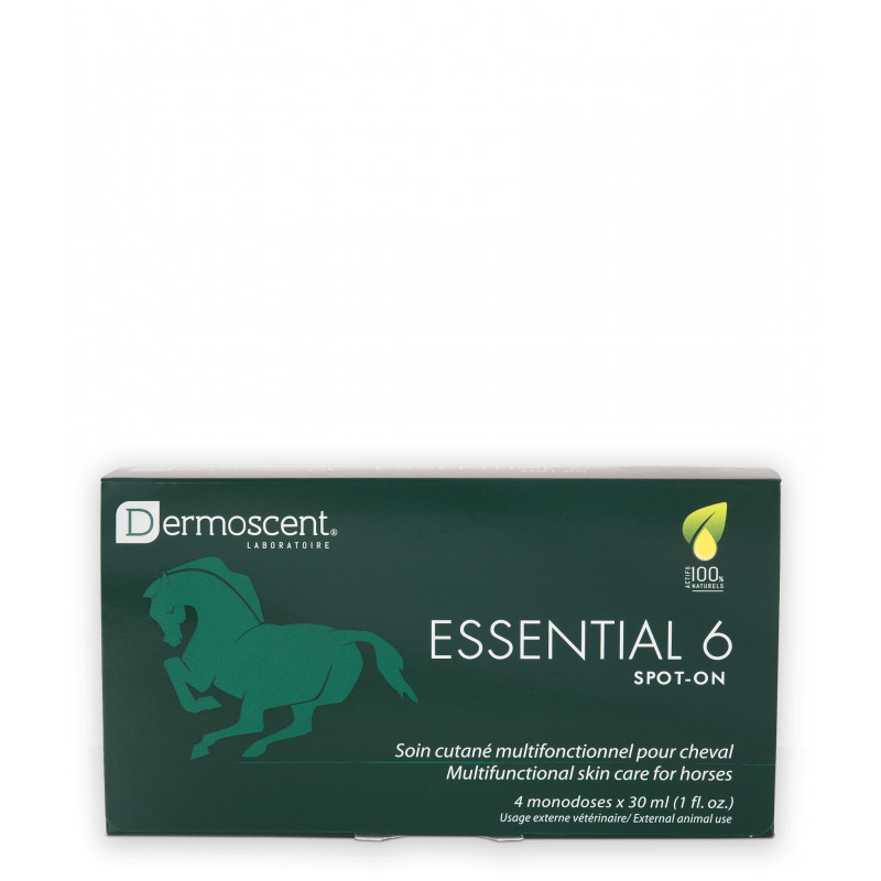 Dermoscent Essential 6 Spot-on egyadagos, multifunkcionális bőrápoló ló számára egy szabadalmaztatott bőrápoló termék, amely 100%-ban természetes hatóanyagokat tartalmaz: 10 illóolaj komplexét (szegfűszeg, kámfor, téli zöld, rozmaring, kurkuma, oregánó, levendula, borsmenta, teafa és cédrus), valamint kendermag- és neem olajat, amelyek gazdagok esszenciális zsírsavakban és E-vitaminban.