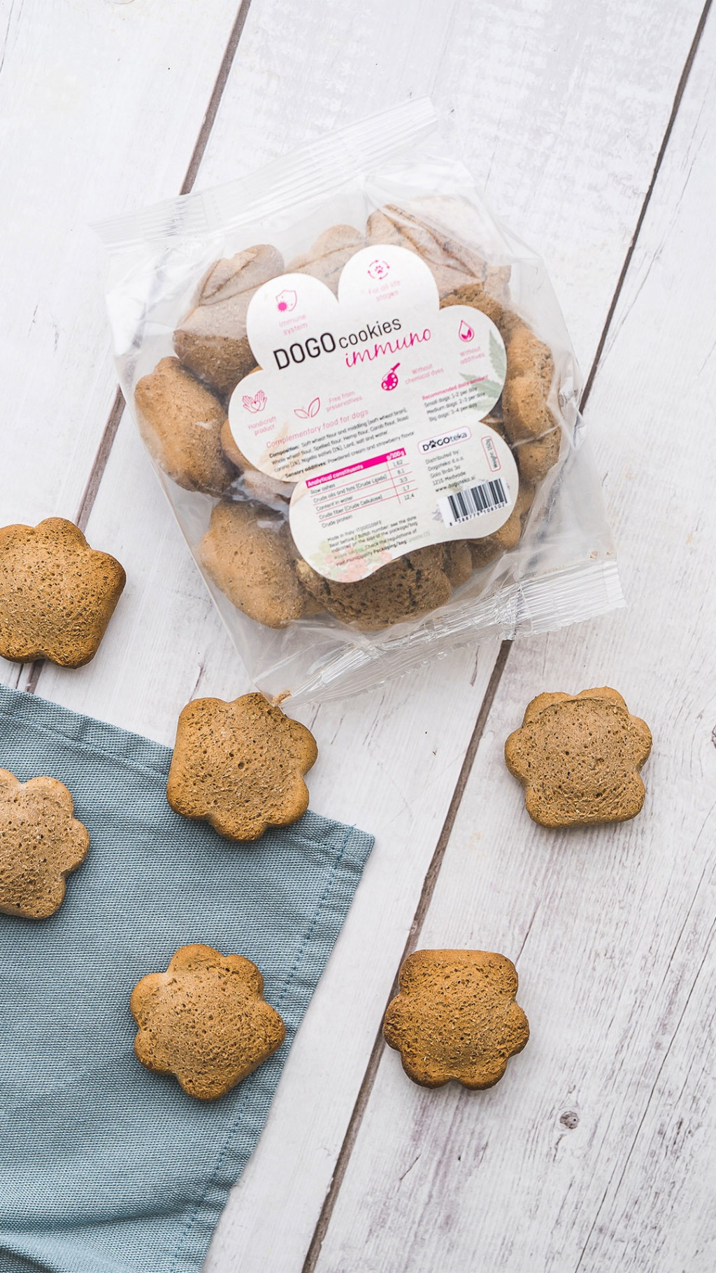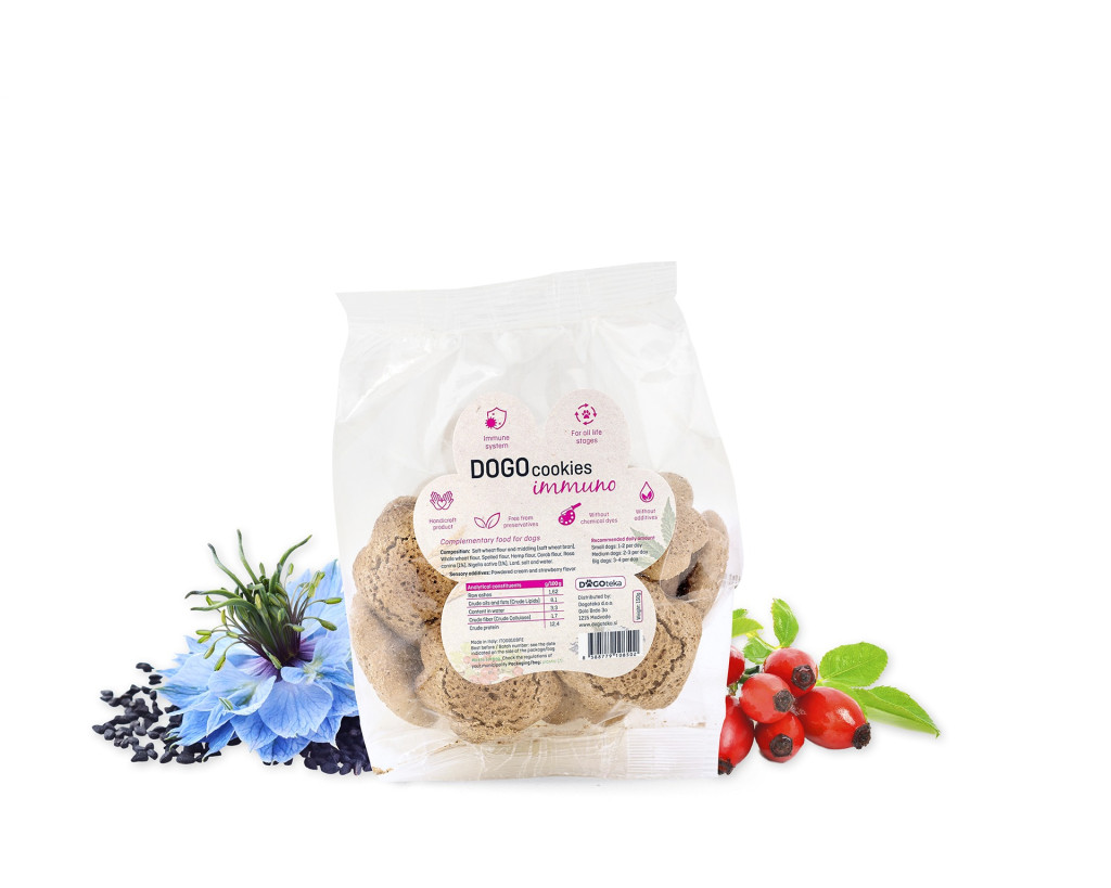 A DogoCookies Immuno természetes alapanyagokból készült jutalomfalat, amely minden fajtájú és korú kutyának adható.