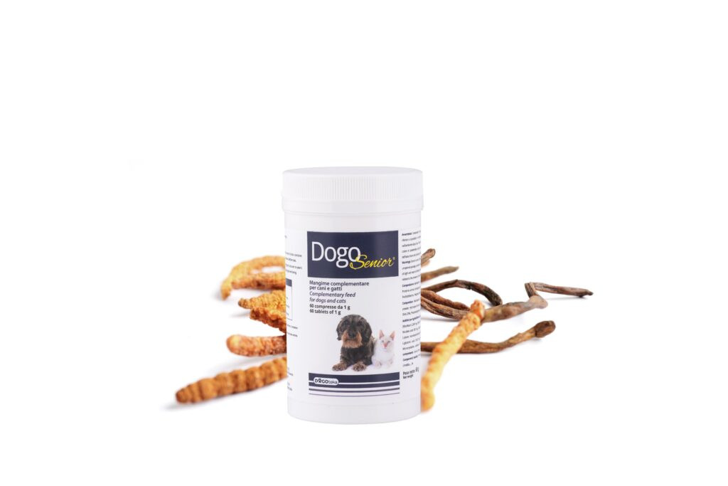 A DogoSenior® tabletta formában készült kiegészítő készítmény, amely a gyógygombák mellett egyéb, célzottan válogatott hatóanyagokat is tartalmaz az időskori egészségi állapot komplex támogatásához