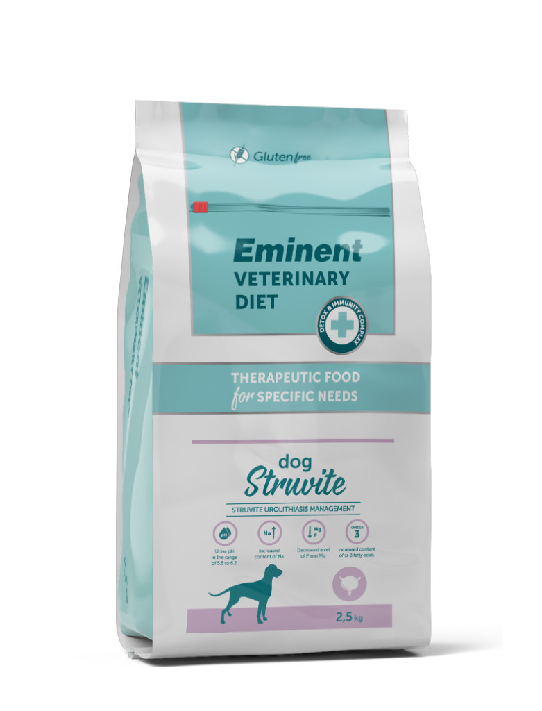 A struvit urolithiasisban (struvit kő) szenvedő betegek kezelésének nagyon fontos része a megfelelő táplálék kiválasztása, hogy a vizelet pH-ját olyan szinten tartsák, amelyben a struvit kristályok feloldódnak. Ezenkívül a kutyatápnak a struvit alkotóelemek csökkentett szintjét kell tartalmaznia, hogy megakadályozza azok újraképződését. Ezeknek a különleges követelményeknek felel meg a teljesértékű Eminent Diet Dog Struvite kutyatáp. Másik funkcionális alkotóeleme az áfonya, amely proanthocianidineket tartalmaz, amely a baktériumok felületéhez kötődik, és így megakadályozza azok húgycső falához való kötődését. Ezáltal elősegítik az egész kiválasztó rendszer bakteriális fertőzéseinek megelőzését.