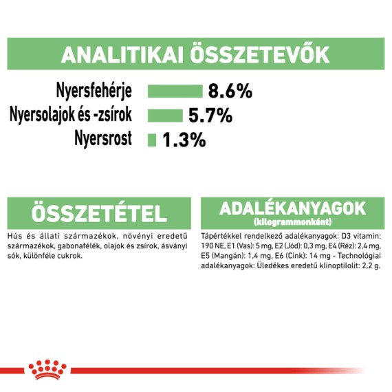 A ROYAL CANIN® Digestive Care Loaf (pástétom) minden testméretű kutya számára alkalmas. A Royal Canin kenneljeiben tesztelt ROYAL CANIN® Digestive Care Loaf kitűnően emészthető fehérjék mellett a kiegyensúlyozott bélflóra fenntartásához szükséges prebiotikumok és rostok keverékét is tartalmazza – ami végső soron elősegíti az optimális bélsárminőség elérését.